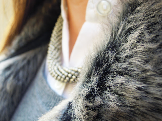 Me encanta el color gris, asi que tu look también. Muy monos tus complementos, el collar es precioso!!