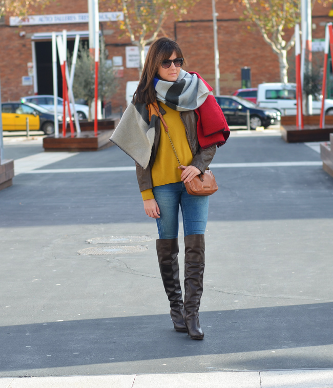 Hoy repito look con la bufanda - capa - manta. La he combinado con colores marrones con la chaqueta perfecto y jersey color mostaza.